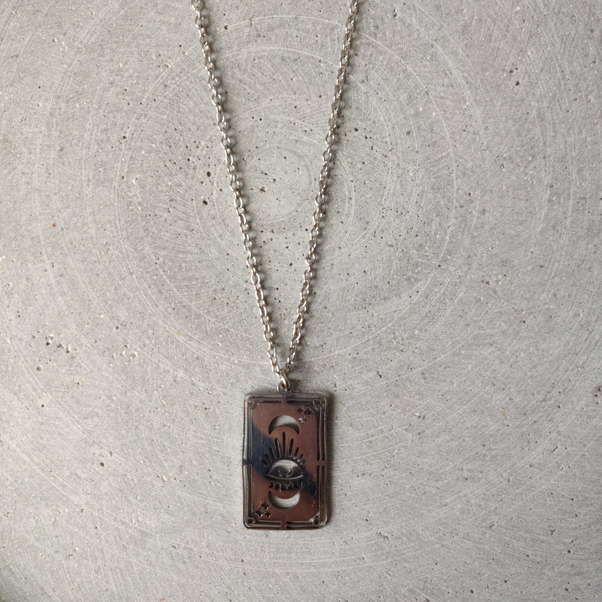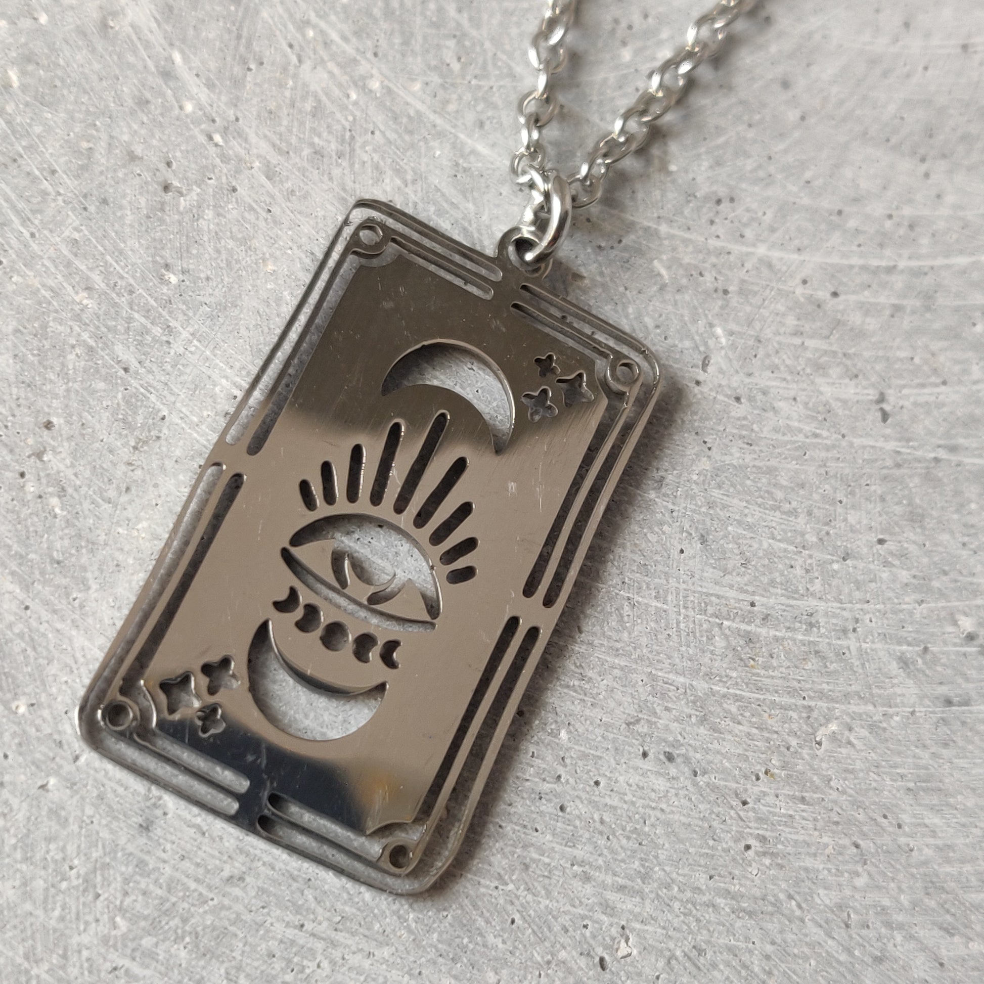 Eye Moon stainless steel pendant, measures 32mm, cut out detail depicting eye, moons and stars.