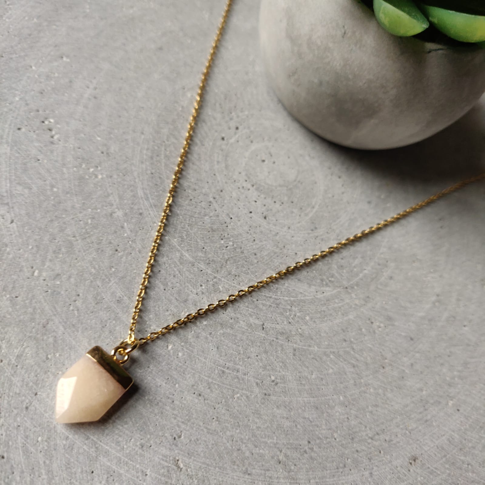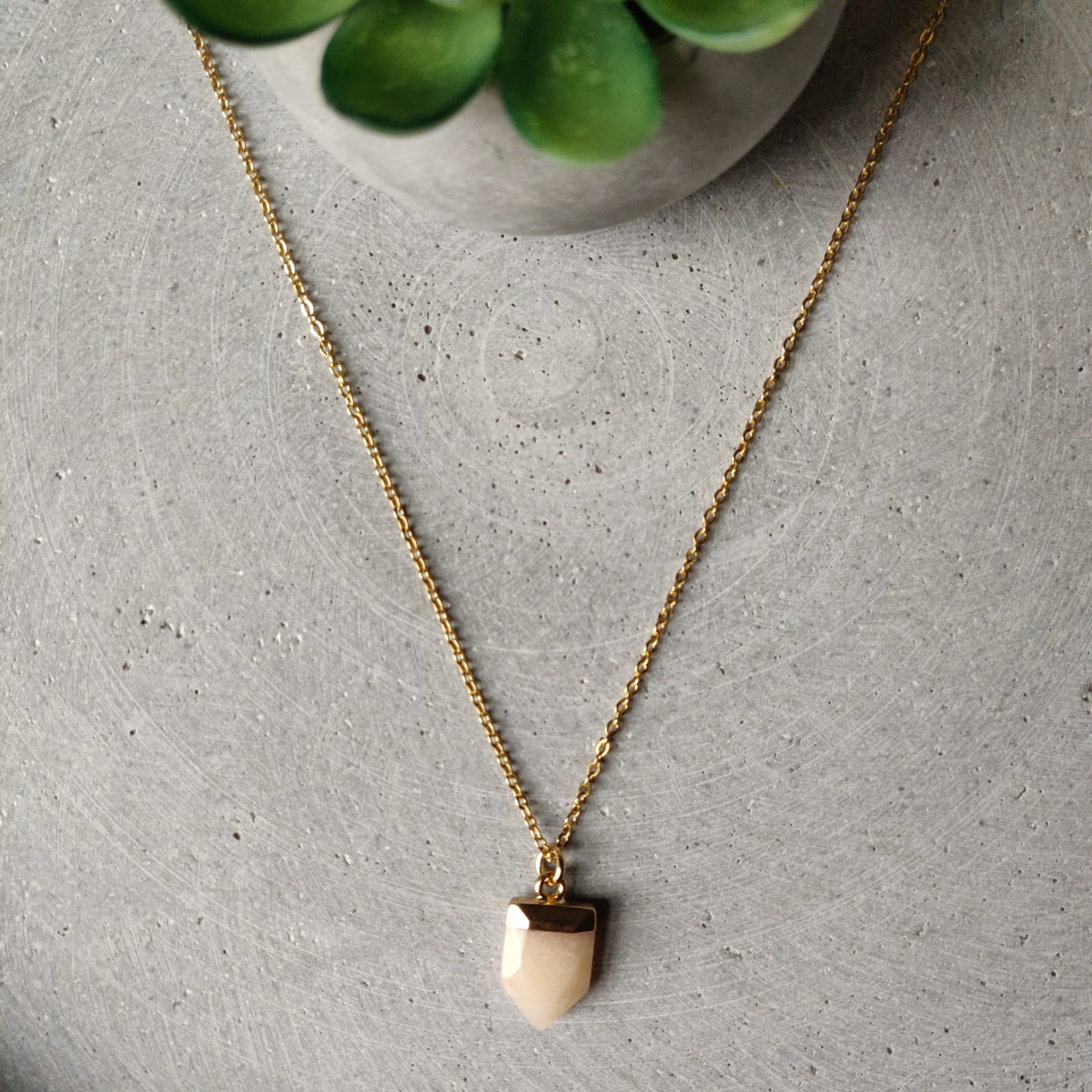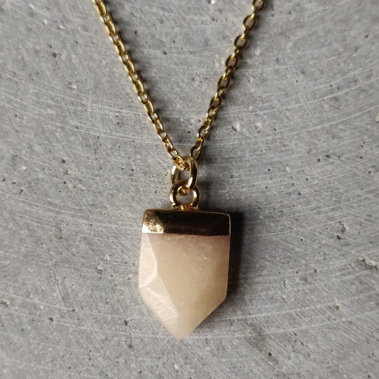 Pink Aventurine semi precious arrow pendant approx 15mm in length, presented on an 18 inch gold tone stainless steel chain.