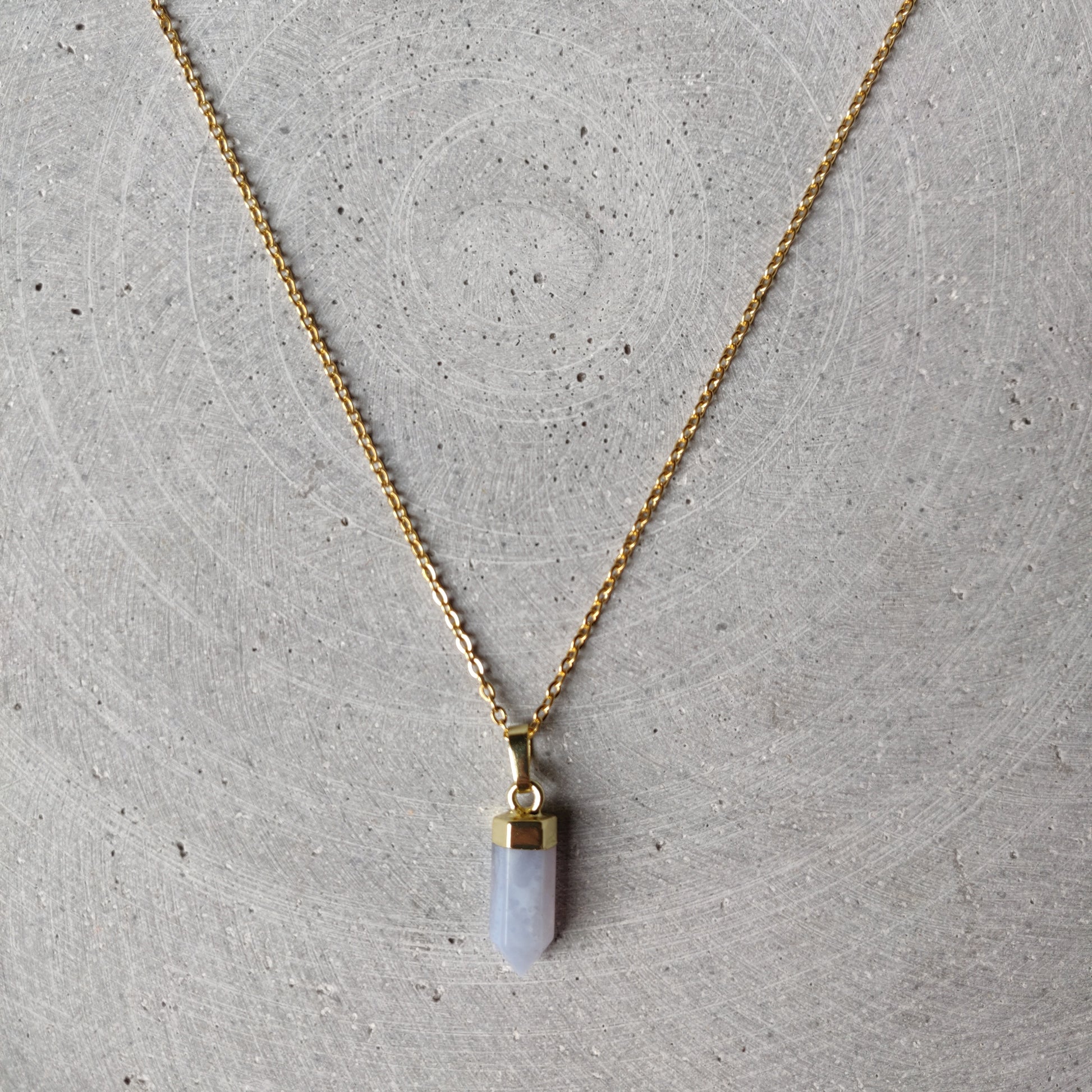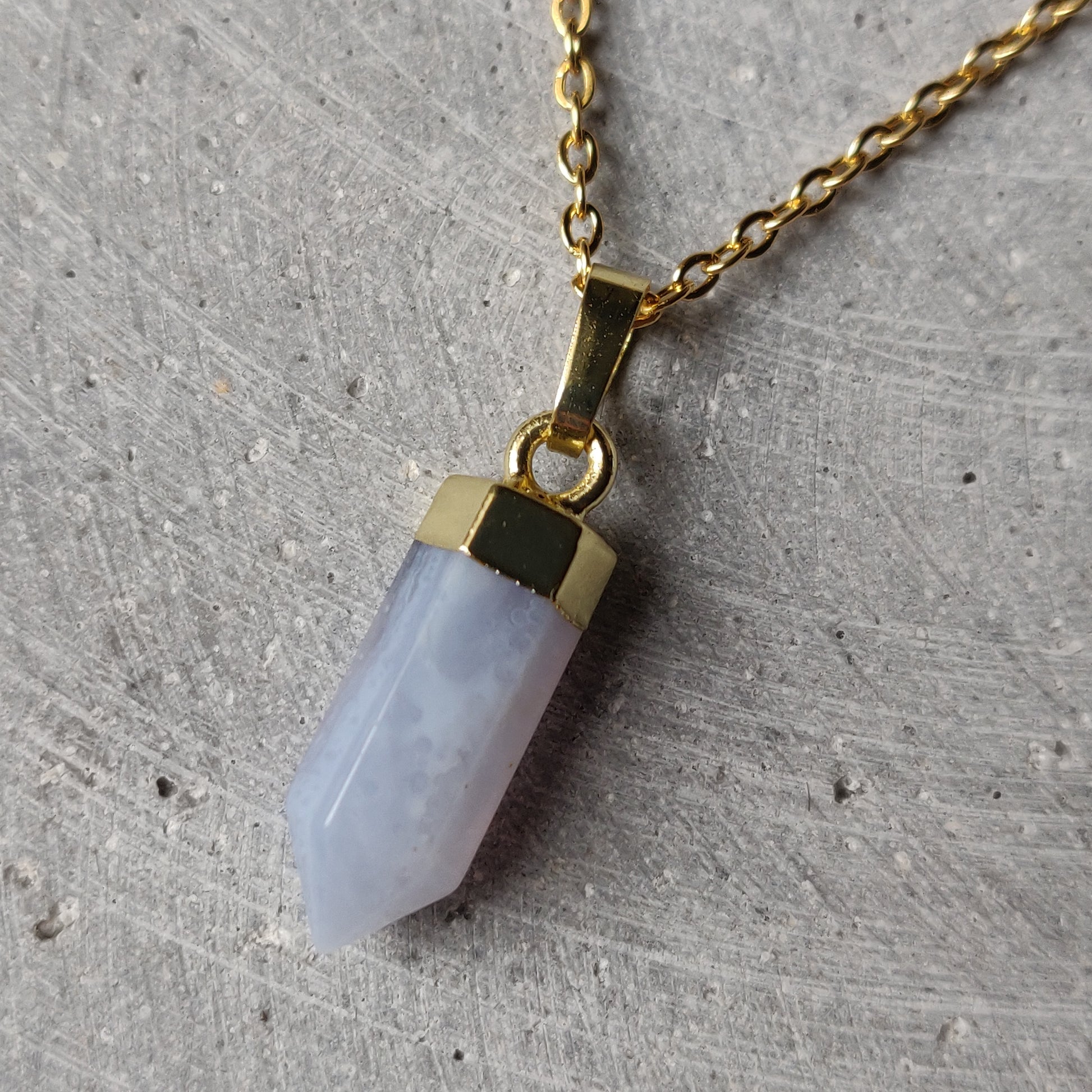 A delicate Blue Lace Agate point, 15mm in length with a gold tone brass bail, presented on an 18 inch stainless steel chain.