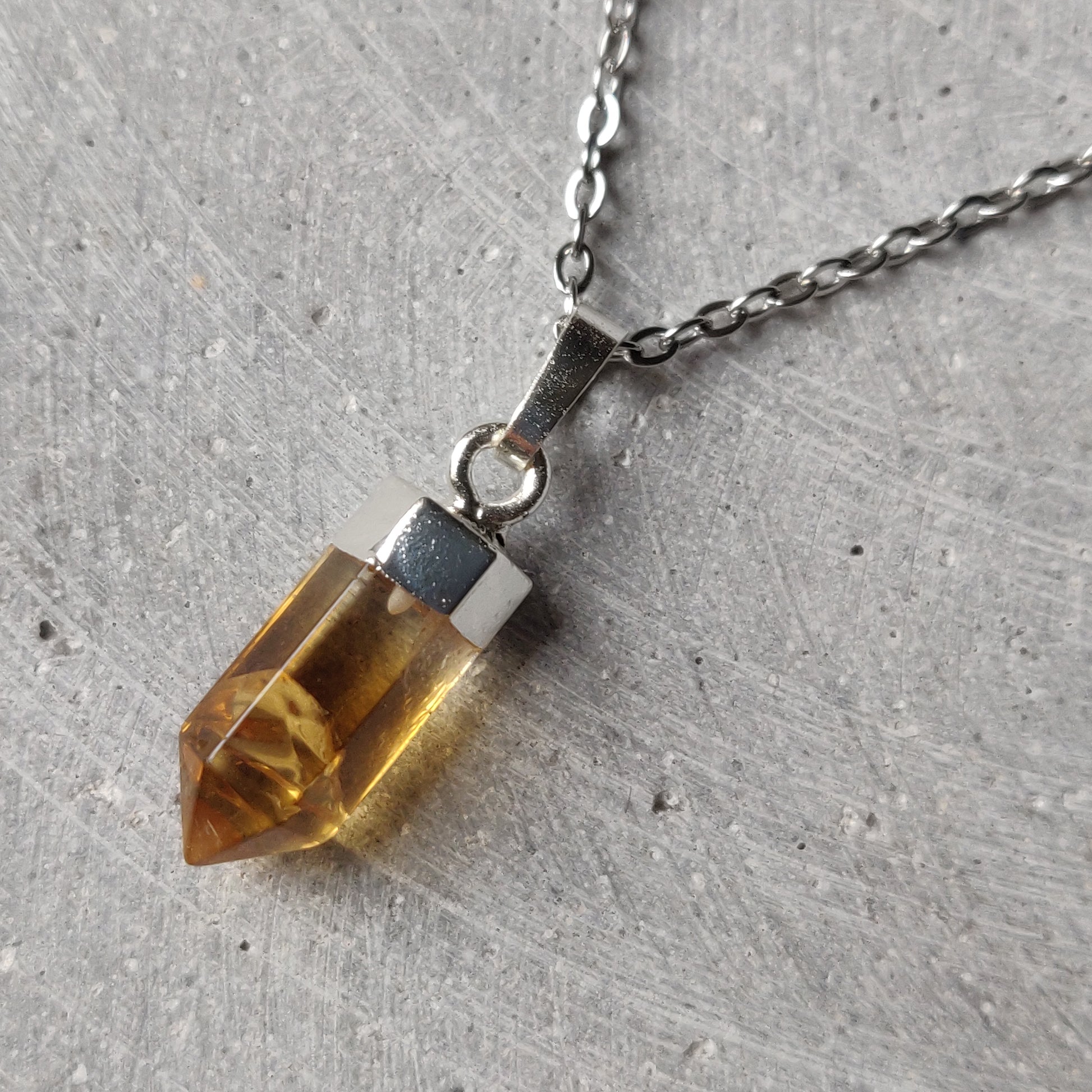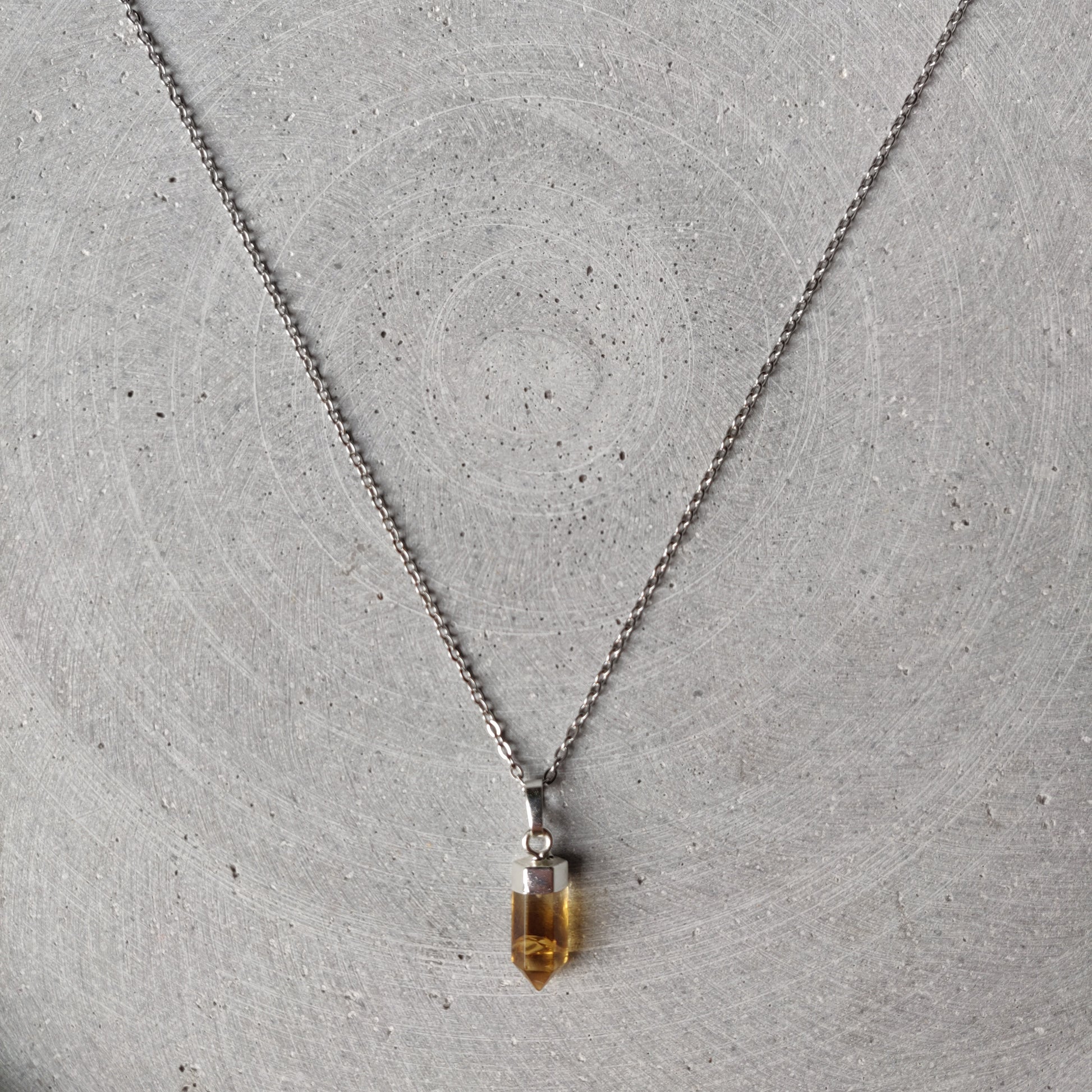 A delicate Citrine point, 15mm in length with a brass bail, presented on an 18 inch stainless steel chain.