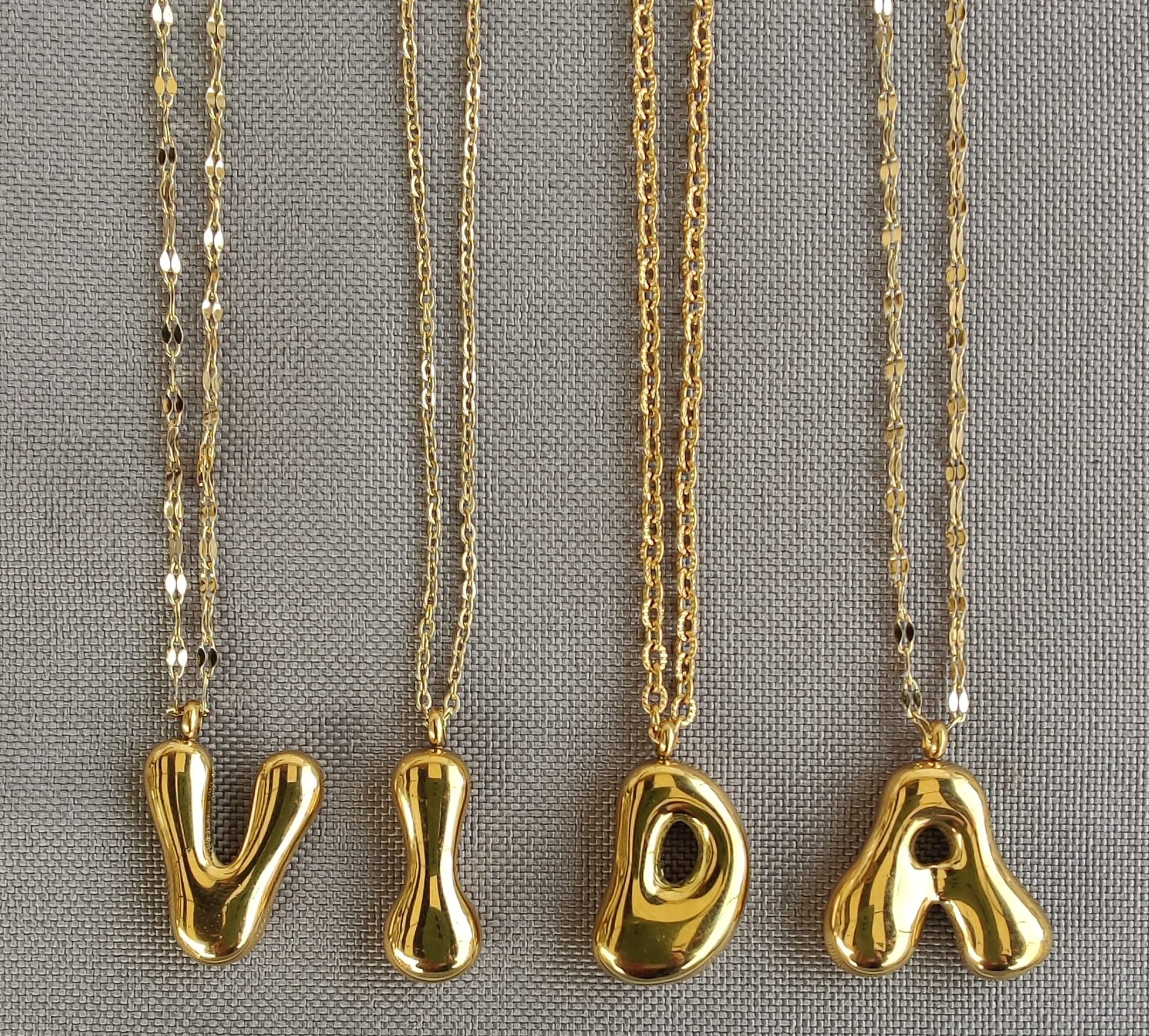 Gold ION plated stainless steel hypoallergenic bubble design inital letter necklace.