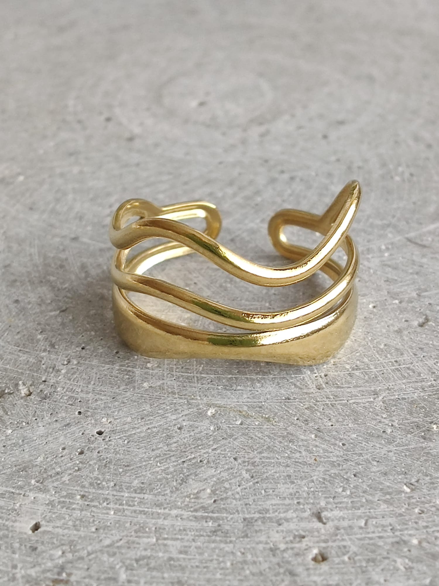 Gold Tone stainless steel wave wrap adjustable ring, 5 to 12mm depth.