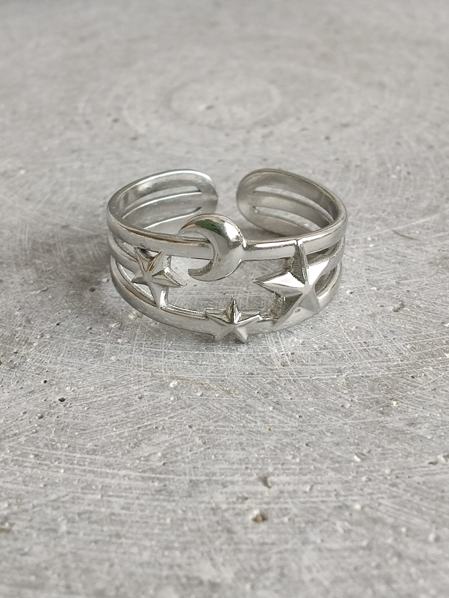 Triple layer moon & star stainless steel adjustable ring, 6 to 10mm depth.