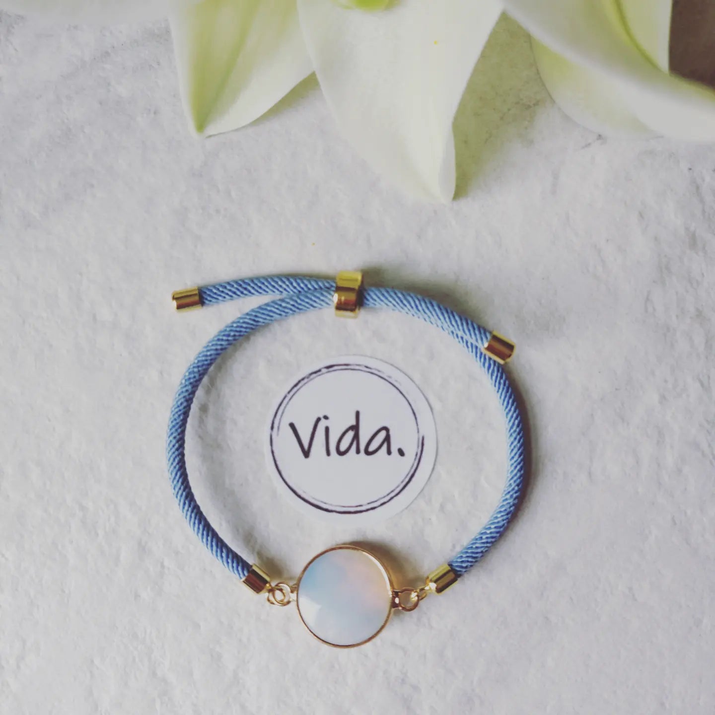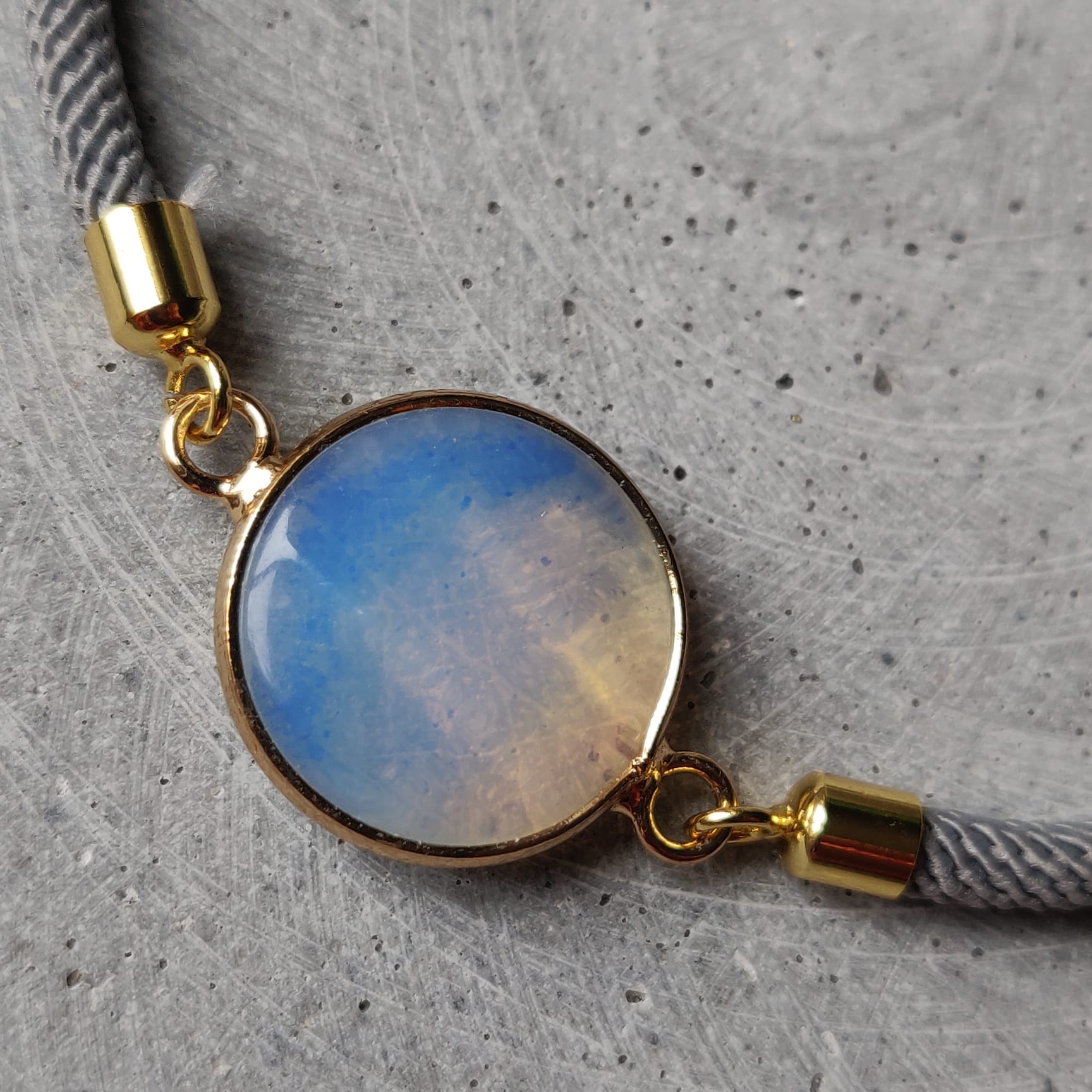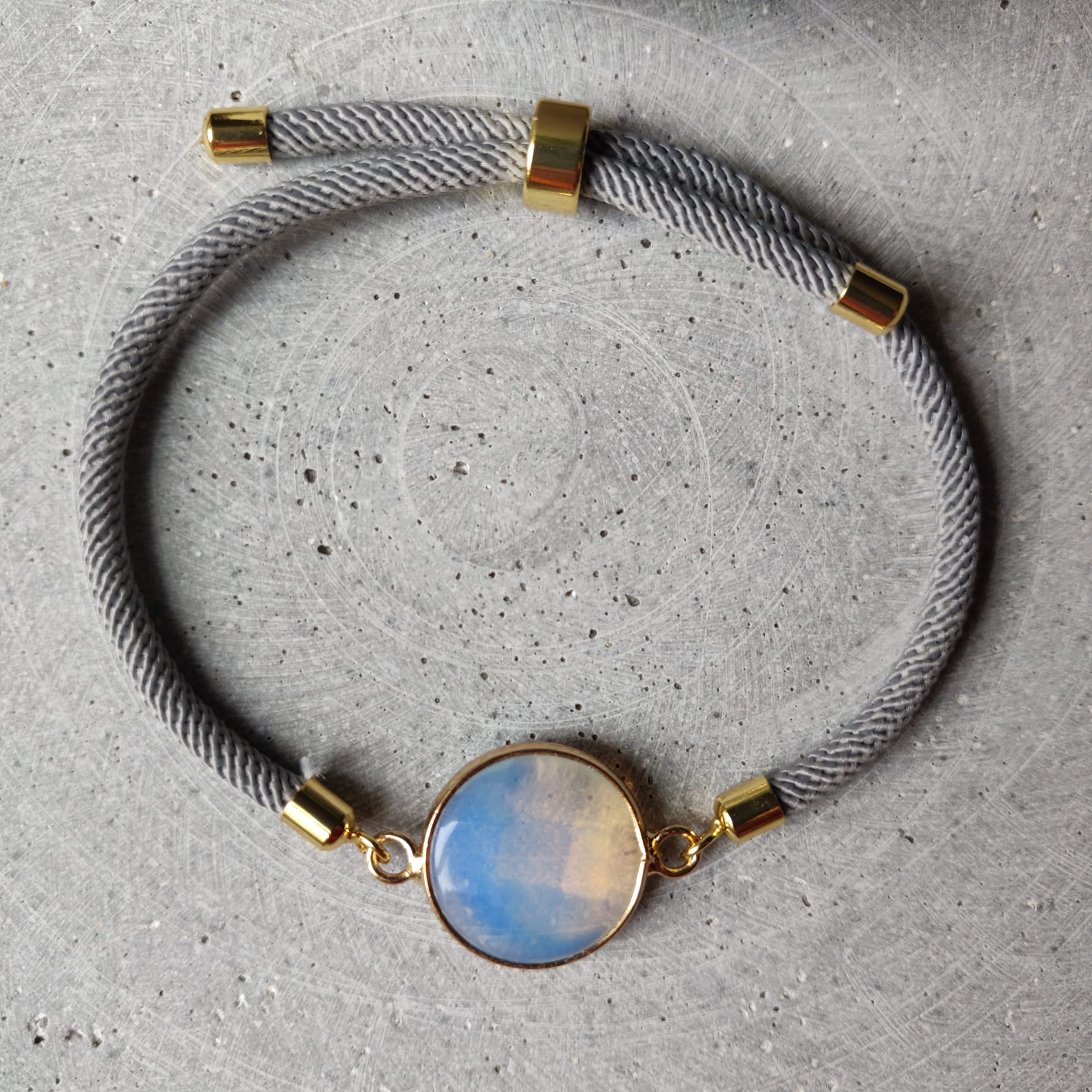 Faceted round opalite semi precious stone, 15mm in width with gold tone brass surround, presented on an adjustable twisted cord bracelet.