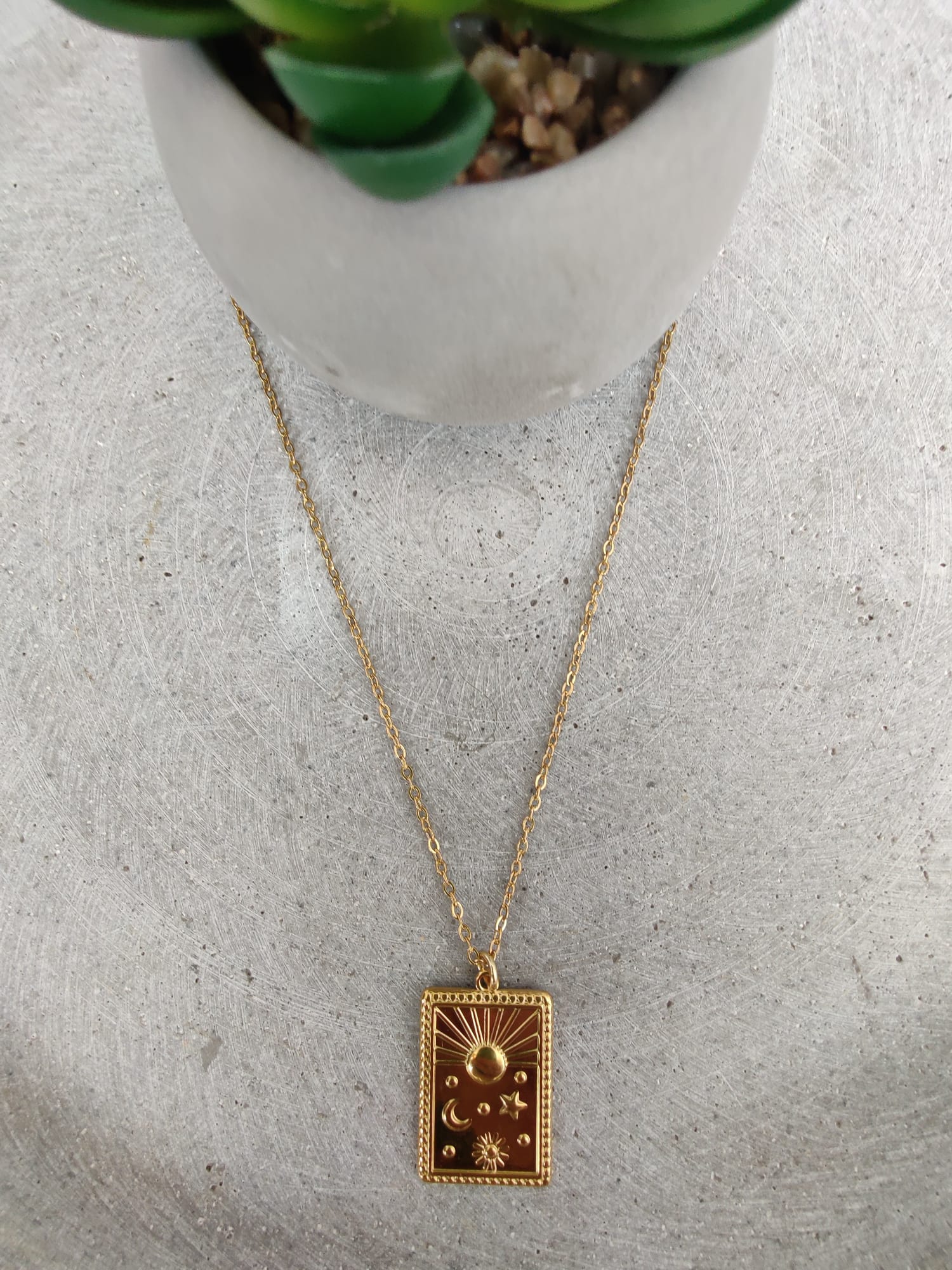 Solid rectangular sun moon stars gold tone pendant, measuring 24mm by 17mm, presented on an 18 inch gold tone stainless steel chain.