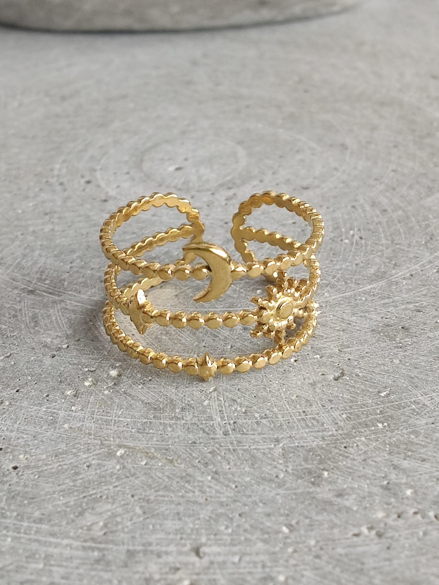 Sun & Moon Triple Layer Gold Tone Stainless Steel Adjustable Ring