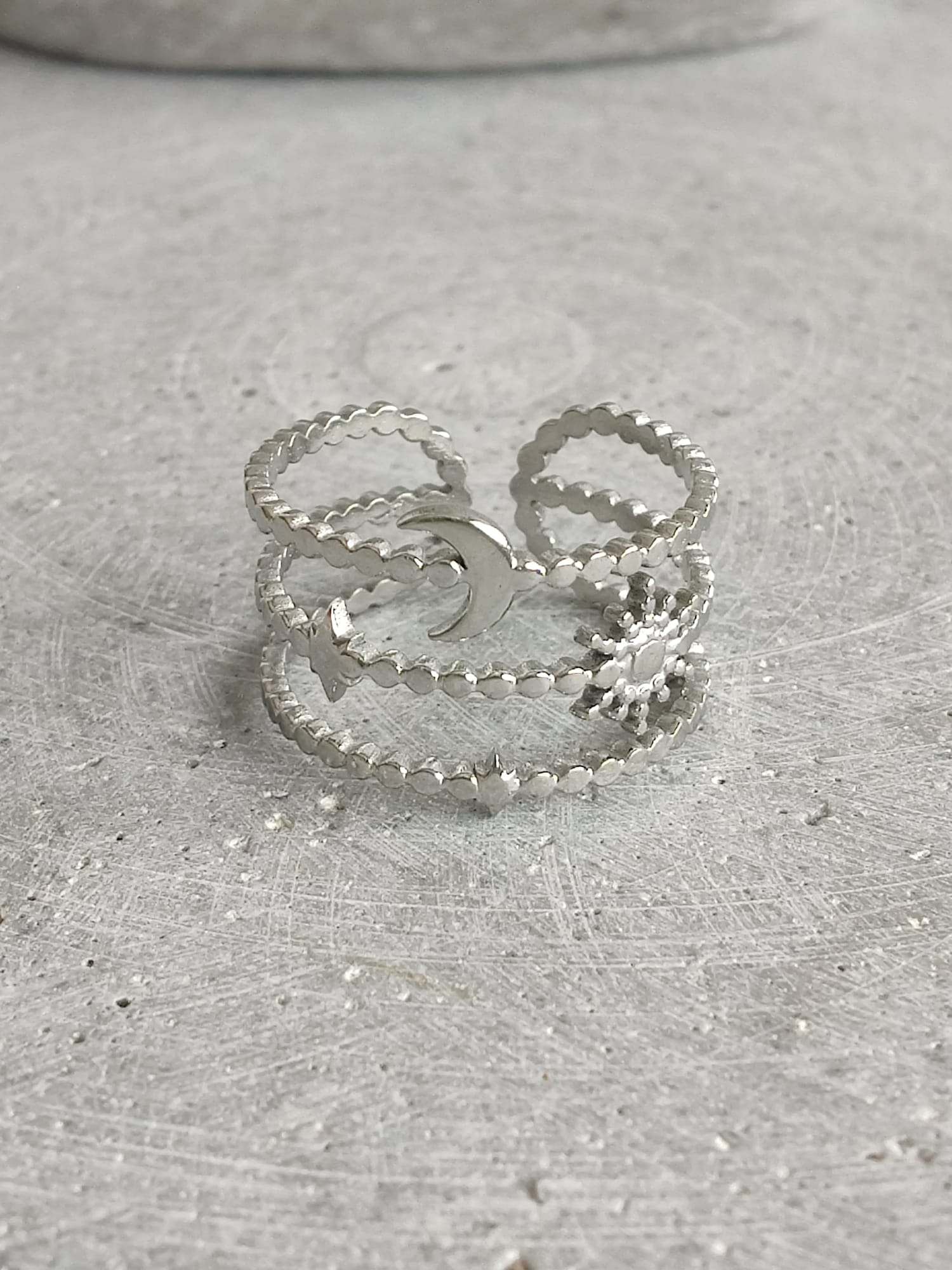 Sun and moon triple layer stainless steel adjustable open cuff ring, 13mm depth.